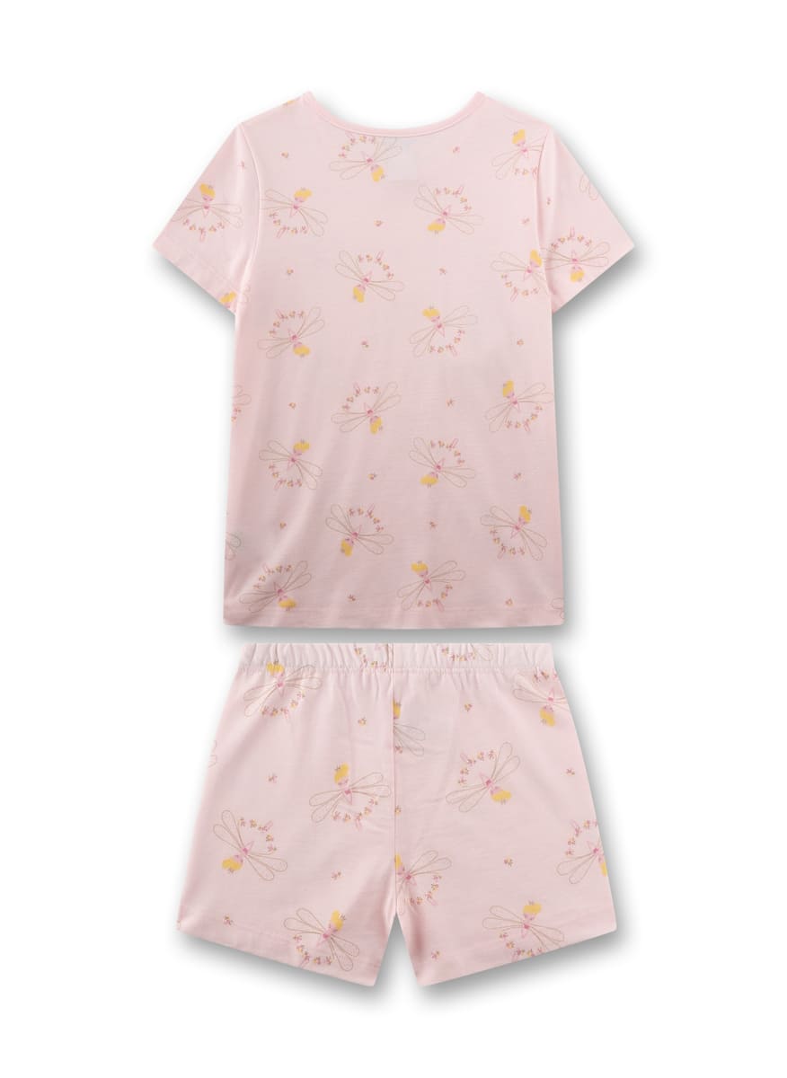 Піжама Dragonfly — легкий і ніжний комплект для дівчаток, що створює атмосферу казки та безтурботних снів. Модель виготовлена з м’якого трикотажу на основі бавовни та модалу, який добре пропускає повітря, приємний до шкіри та забезпечує комфорт у теплі ночі. Футболка з короткими рукавами має круглий виріз із маленьким декоративним бантиком, що додає образу ніжності. Шорти з еластичним поясом забезпечують зручну посадку та свободу рухів. Світло-рожеву основу прикрашає чарівний принт із маленькими феями, зірочками та квітами, що надає комплекту казкового настрою.