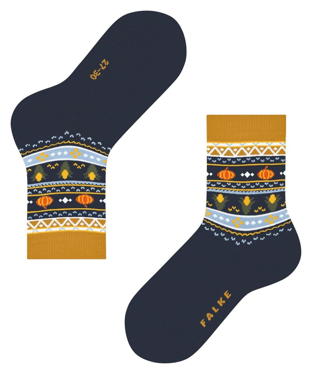 Затишні дитячі шкарпетки Pumpkin Fair із м'якої екологічної бавовни прикрашають осінній норвезький візерунок та чарівна інтерпретація мотивів гарбуза та кукурудзи. Контрастні манжети забезпечують ідеальну посадку, а перевірена часом посадка FALKE гарантує ідеальний комфорт.