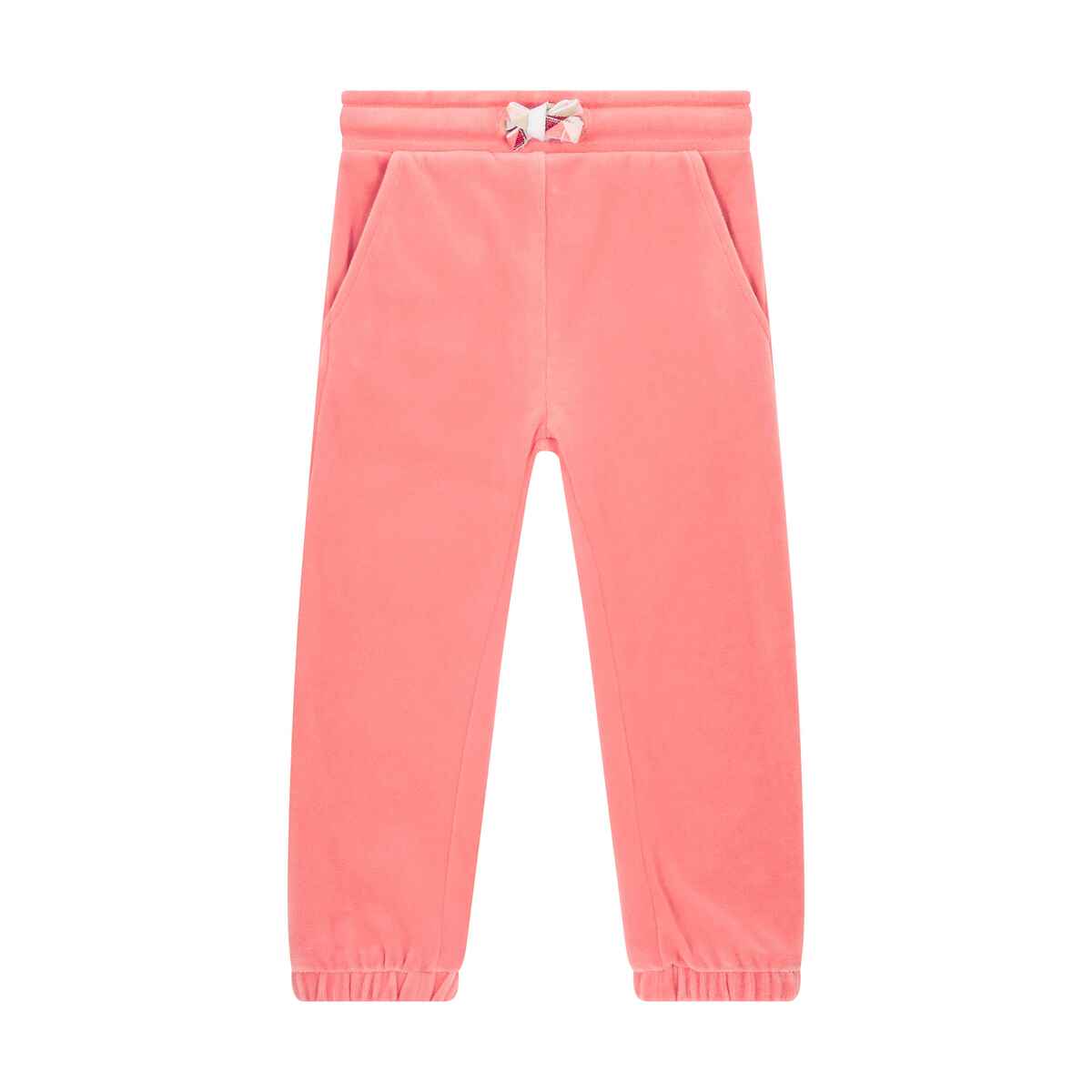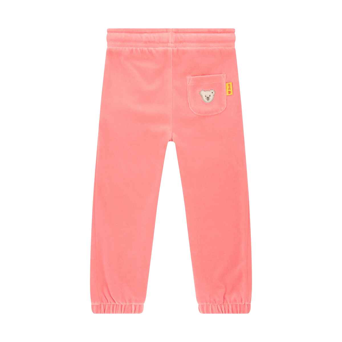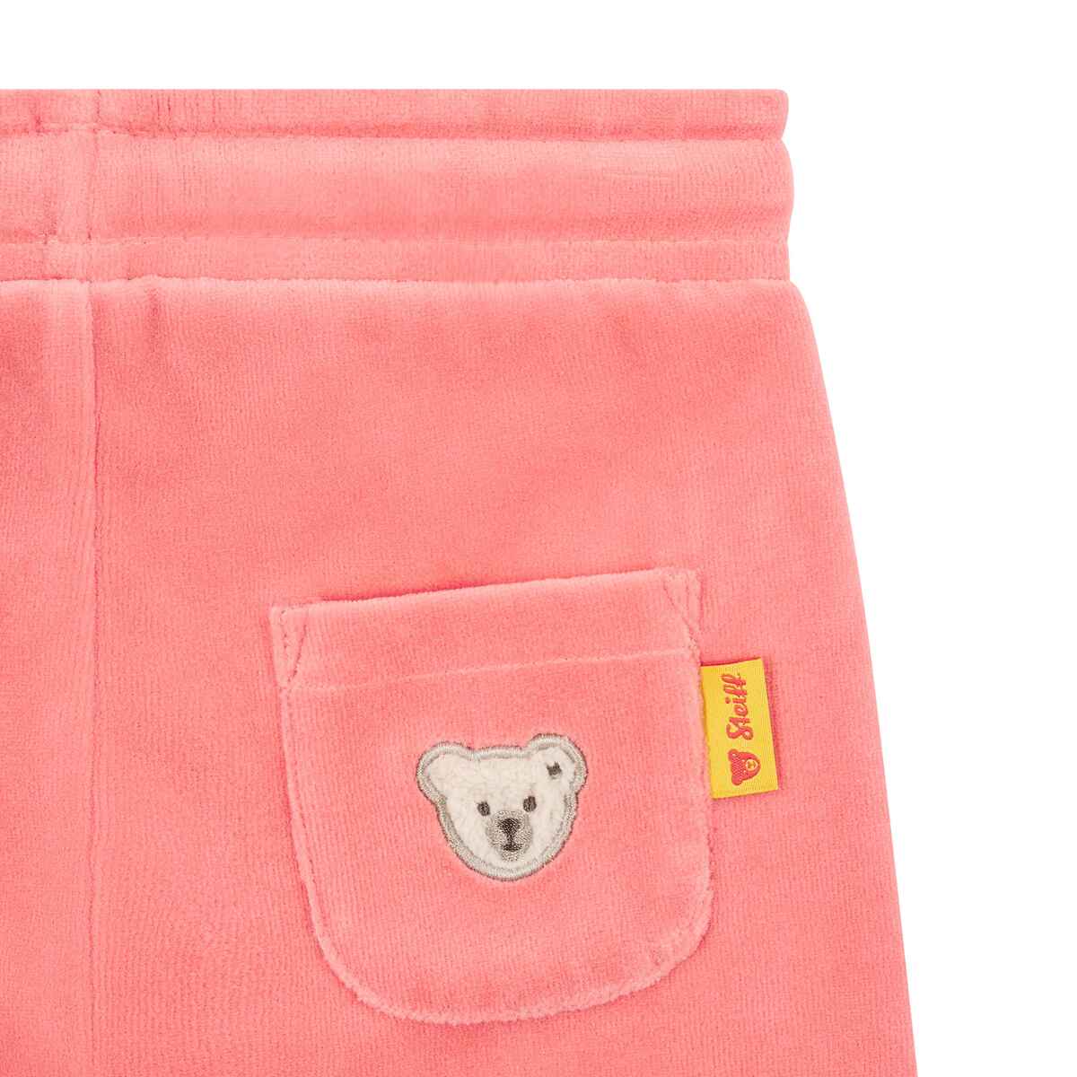 Штани Woodland – чарівні велюрові джоггери у ніжно-рожевому відтінку створені для маленьких модниць. Контрастний бантик-шнурок додає грайливого шарму, а м’яка оксамитова тканина ніжно огортає комфортом. Косі кишені спереду дарують простір для маленьких скарбів, а прямий крій та еластичні манжети забезпечують зручність і свободу рухів. Ззаду розташована мила накладна кишенька з ведмедиком Steiff – деталь, що робить образ ще більш зворушливим.