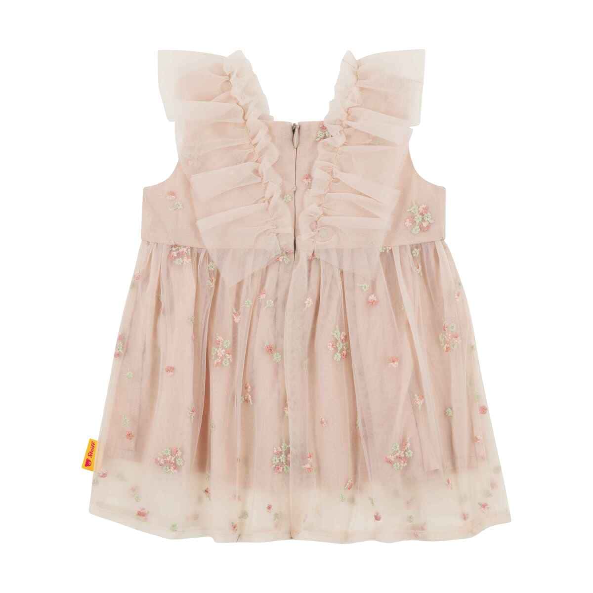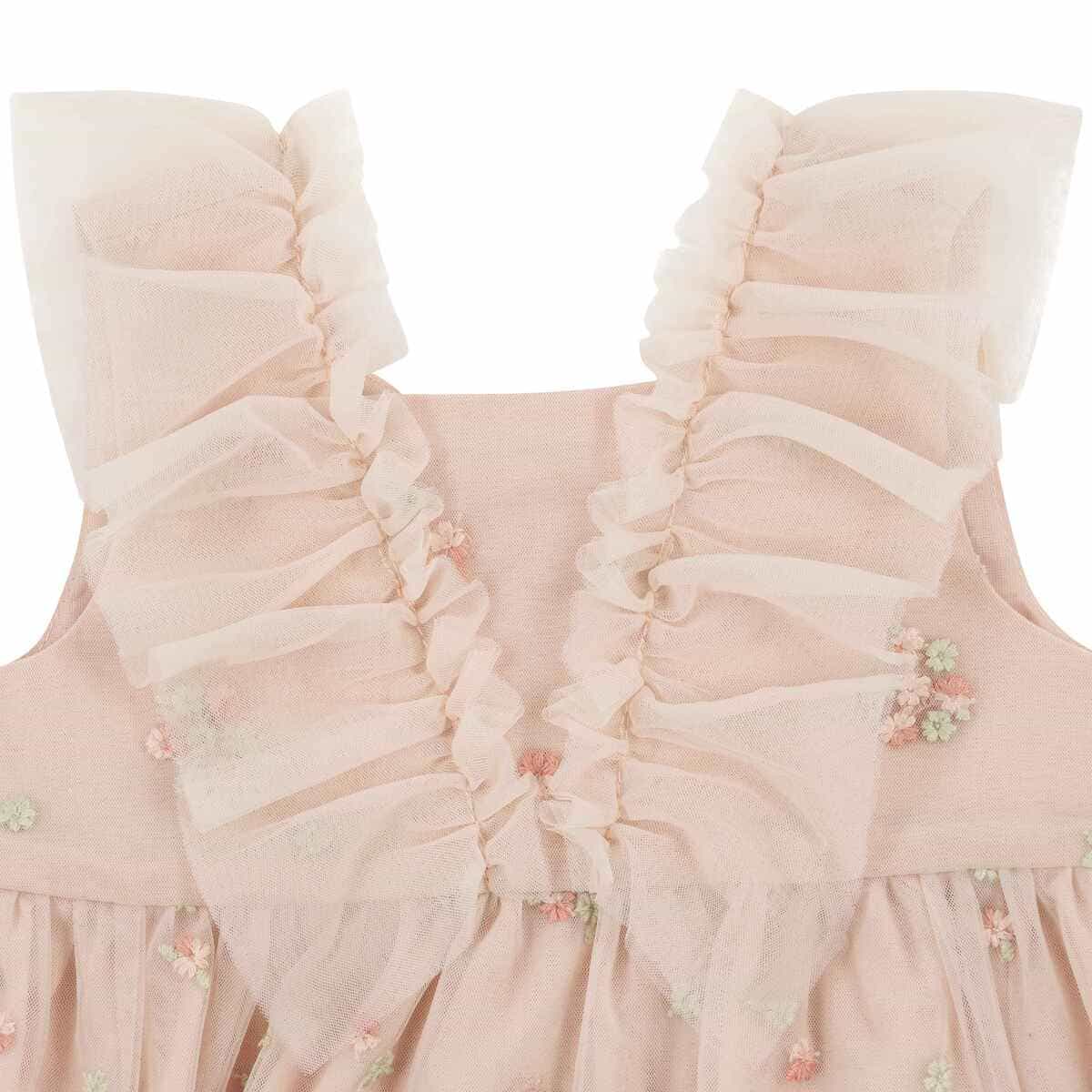 Сукня Western Core вражає своєю повітряною легкістю та витонченим святковим настроєм. Ніжний фатин із делікатною квітковою вишивкою створює романтичний образ і додає виробу особливого шарму. М’яка підкладка дарує приємні відчуття до тіла, забезпечуючи комфорт протягом усього дня. Завищена лінія талії та легкі складки формують гарний силует і свободу рухів. Об’ємні рюші спереду та на плечах підкреслюють елегантність і додають образу грайливості. Потайна застібка ззаду робить перевдягання швидким і зручним.