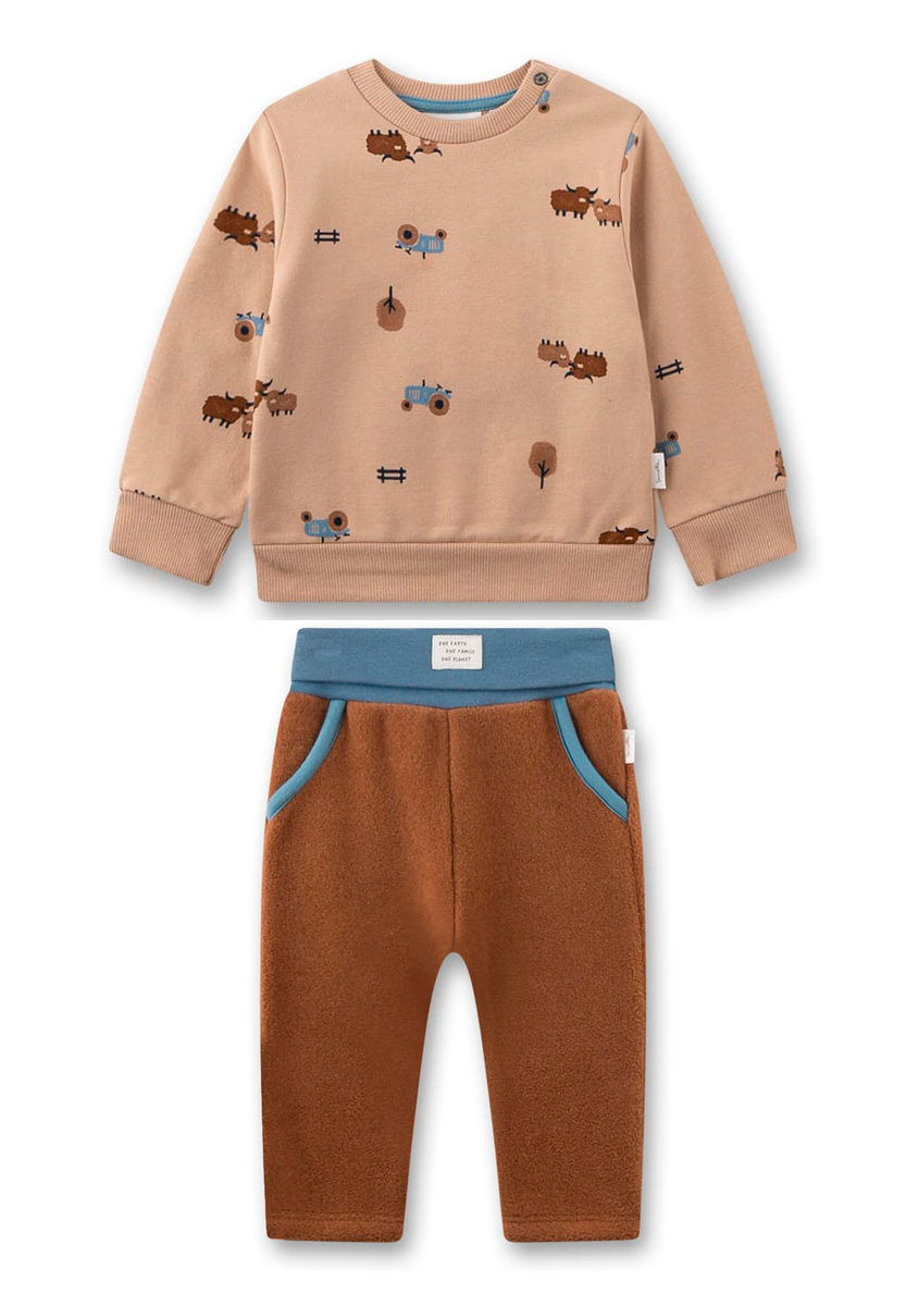 М’який костюм Lambs створений для затишку та свободи рухів малюка. Светрик із милим принтом тракторів та овечок доповнюють теплі штанці з флісовою текстурою. Еластичний пояс забезпечує комфортну посадку, натуральна органічна бавовна з невеликим додаванням еластану приємна до тіла й добре зберігає форму після прання.