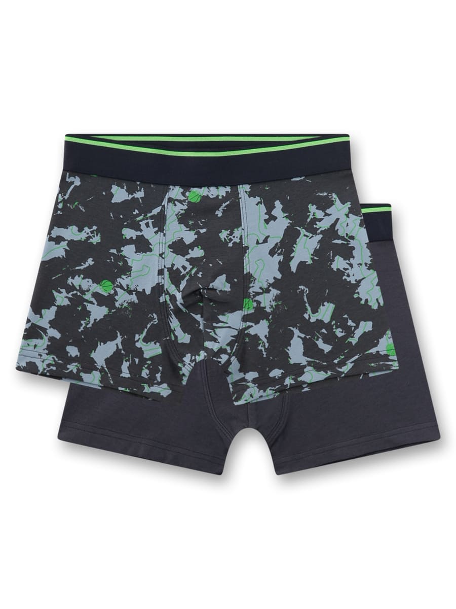 Труси-боксери Green Style — зручний комплект для хлопчиків із двох пар, що поєднує практичність і сучасний дизайн. Модель виготовлена з м’якого бавовняного трикотажу, матеріал добре тягнеться, приємно прилягає до тіла та забезпечує комфорт протягом дня. Одна пара виконана в однотонному темному кольорі, інша прикрашена динамічним камуфляжним принтом із зеленими акцентами. Широкий еластичний пояс гарантує надійну посадку та свободу рухів.