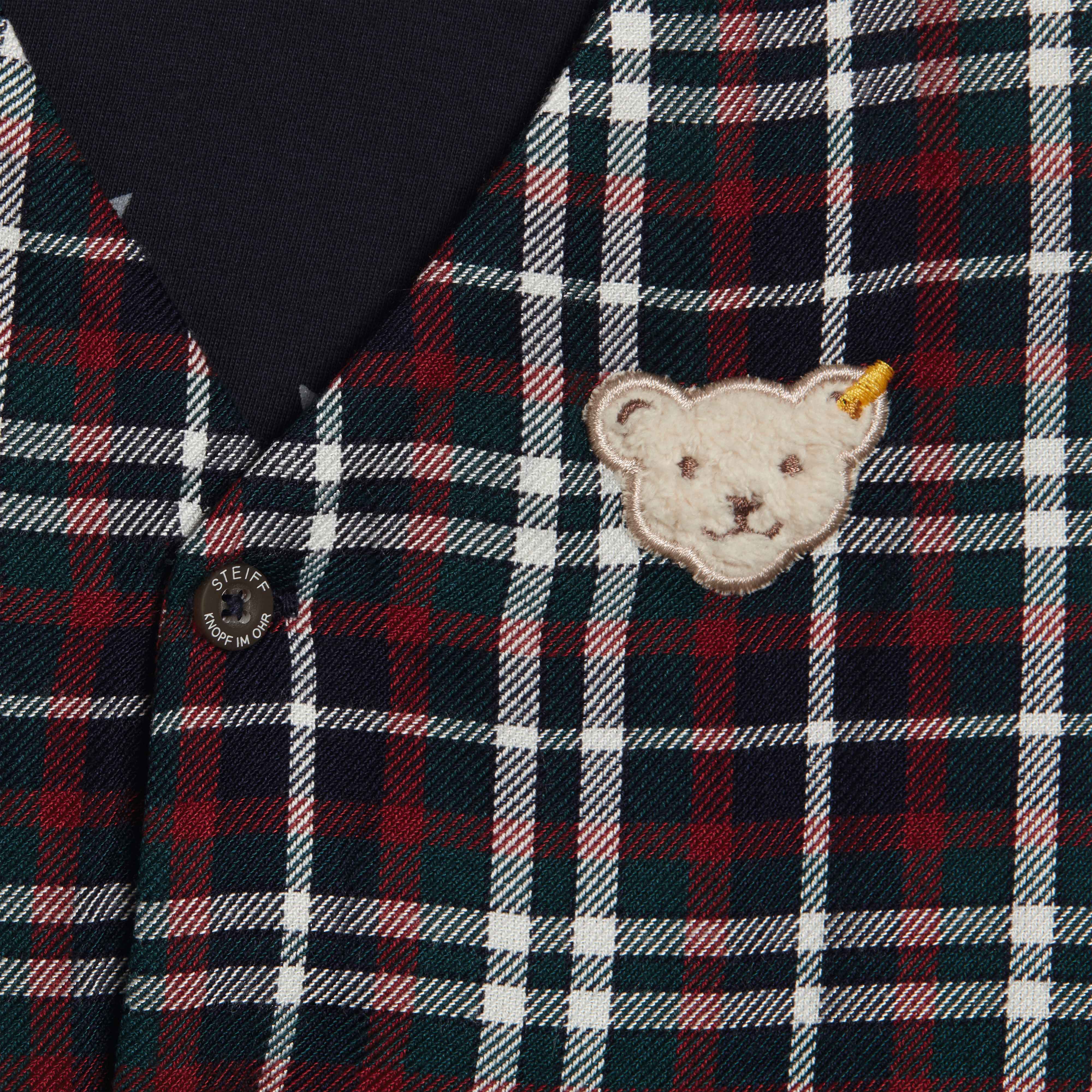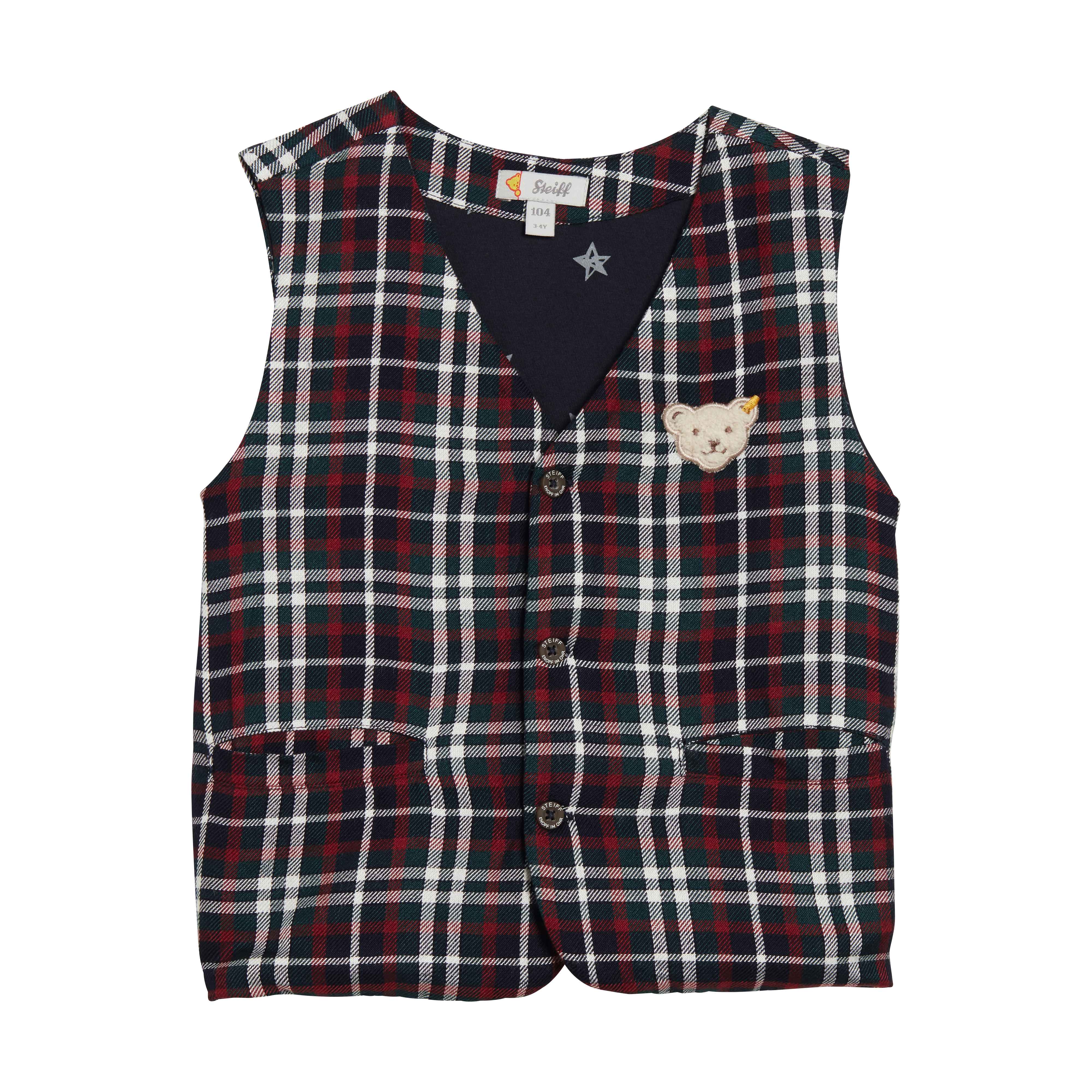 Яскравий, клітчастий жилет Special Day - поєднання унікального стилю та традицій класики. Виготовлений із високоякісного, сертифікованого матеріалу, який забезпечить комфорт під час носіння, гарантуючи повітрообмін. Має красиву підкладку із зображенням зірок. Застібається на ґудзики, дизайн виробу доповнюють прорізні кишені та аплікація у вигляді пухнастого ведмедика Тедді