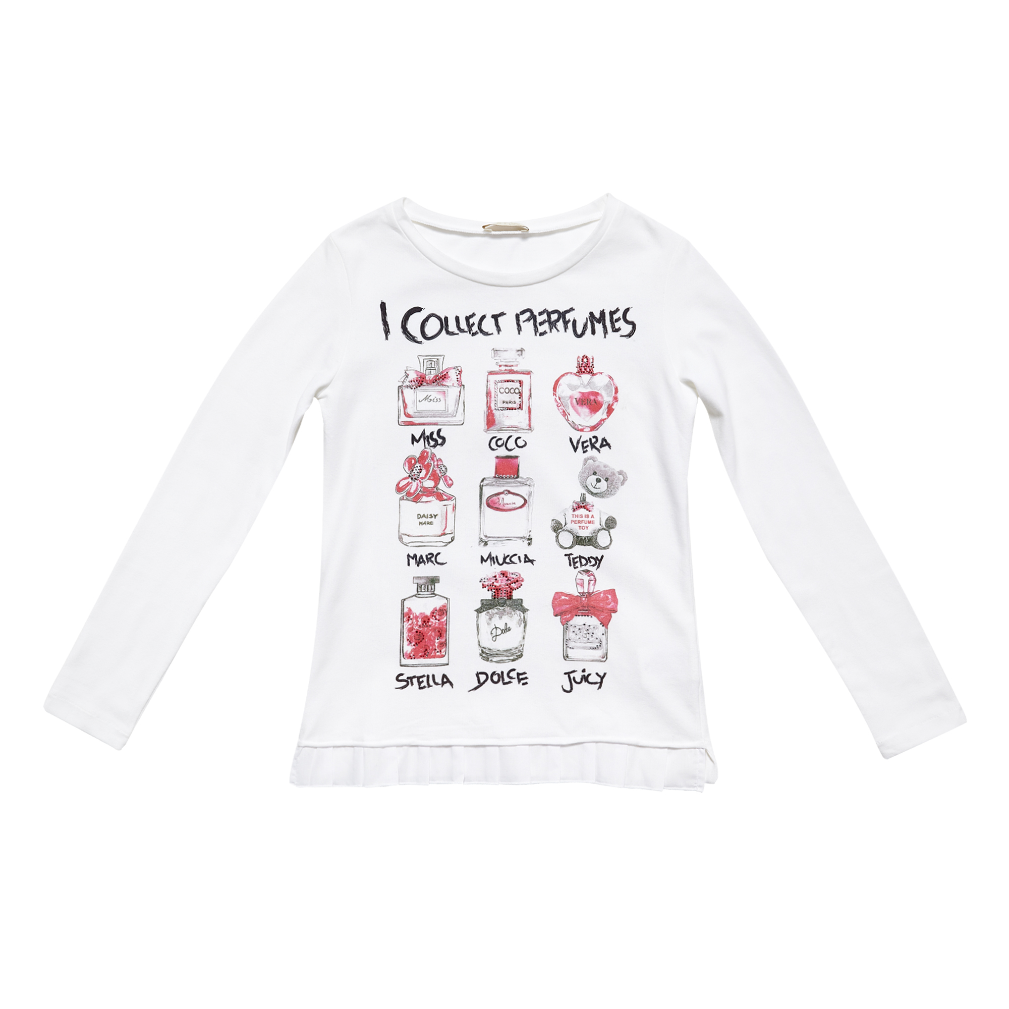 Футболка Essenza отличается стильным художественным принтом с коллекцией парфюмов, который придает образу игривую утонченность. Модель выполнена из мягкого эластичного трикотажа, который приятно ложится по фигуре и обеспечивает комфорт в течение всего дня. Длинные рукава и аккуратный круглый вырез делают силуэт универсальным, нежная окантовка с воланами снизу придает легкий романтический акцент. Идеальный вариант для современных модниц, которые любят детали с характером.