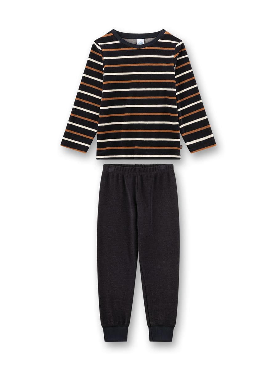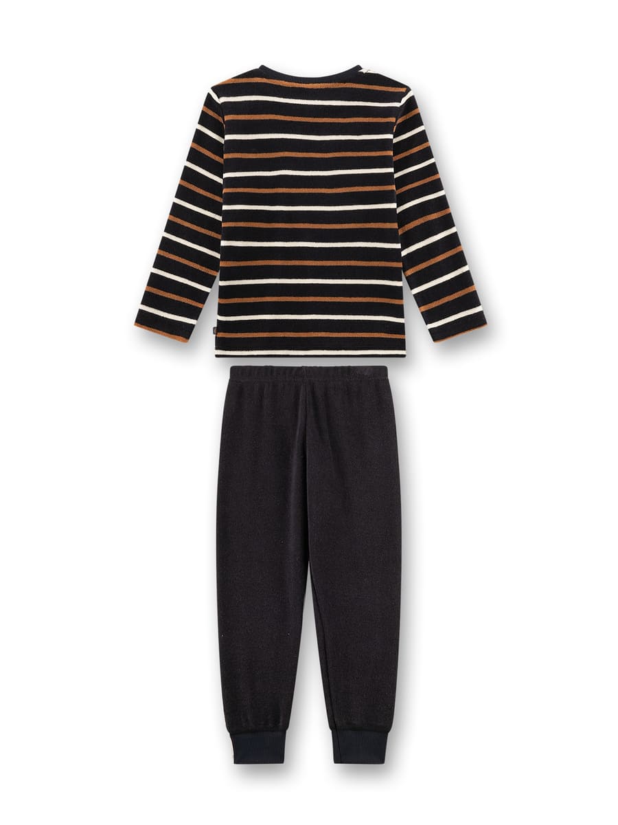 Пижама Stripes из мягкого махрового материала дарит уют и тепло во время сна. Верх с игривыми полосками в бело-коричневых тонах на чёрном фоне создаёт стильный и современный образ. Мягкие брюки с эластичным поясом обеспечивают свободу движений и комфорт на всю ночь. Это идеальный выбор для уютных вечеров и сладких снов.