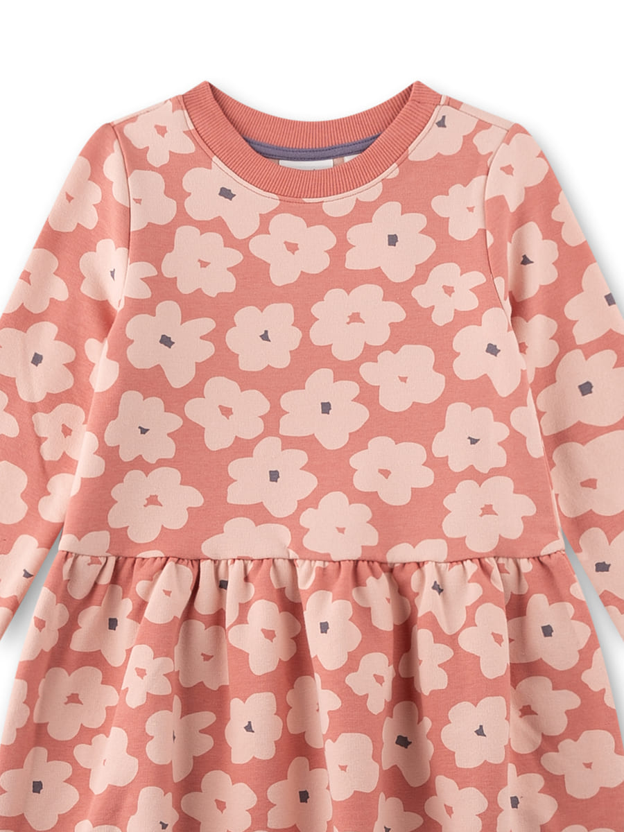 Платье Flowers очаровывает своим ярким цветочным принтом и нежным розовым оттенком. Модель выполнена из мягкого трикотажа из органического хлопка с добавлением эластана, что обеспечивает приятные ощущения на коже и свободу движений. Завышенная талия и расклёшенный подол придают платью лёгкий, игривый силуэт, а длинные рукава делают его идеальным выбором для прохладных дней. Удобное, уютное и стильное — это платье станет любимым нарядом маленькой модницы.