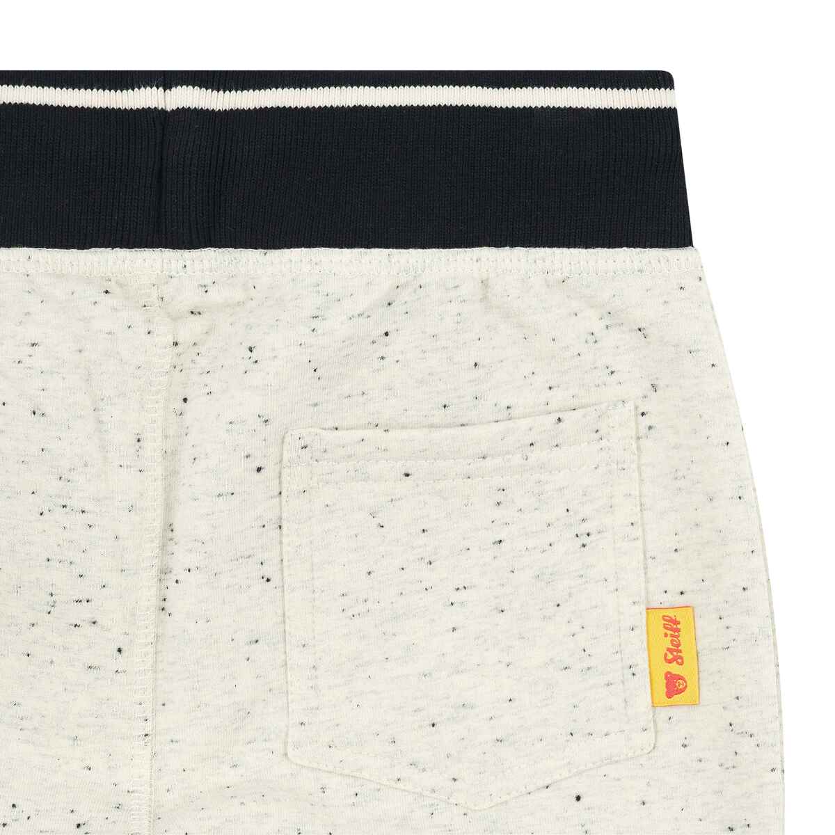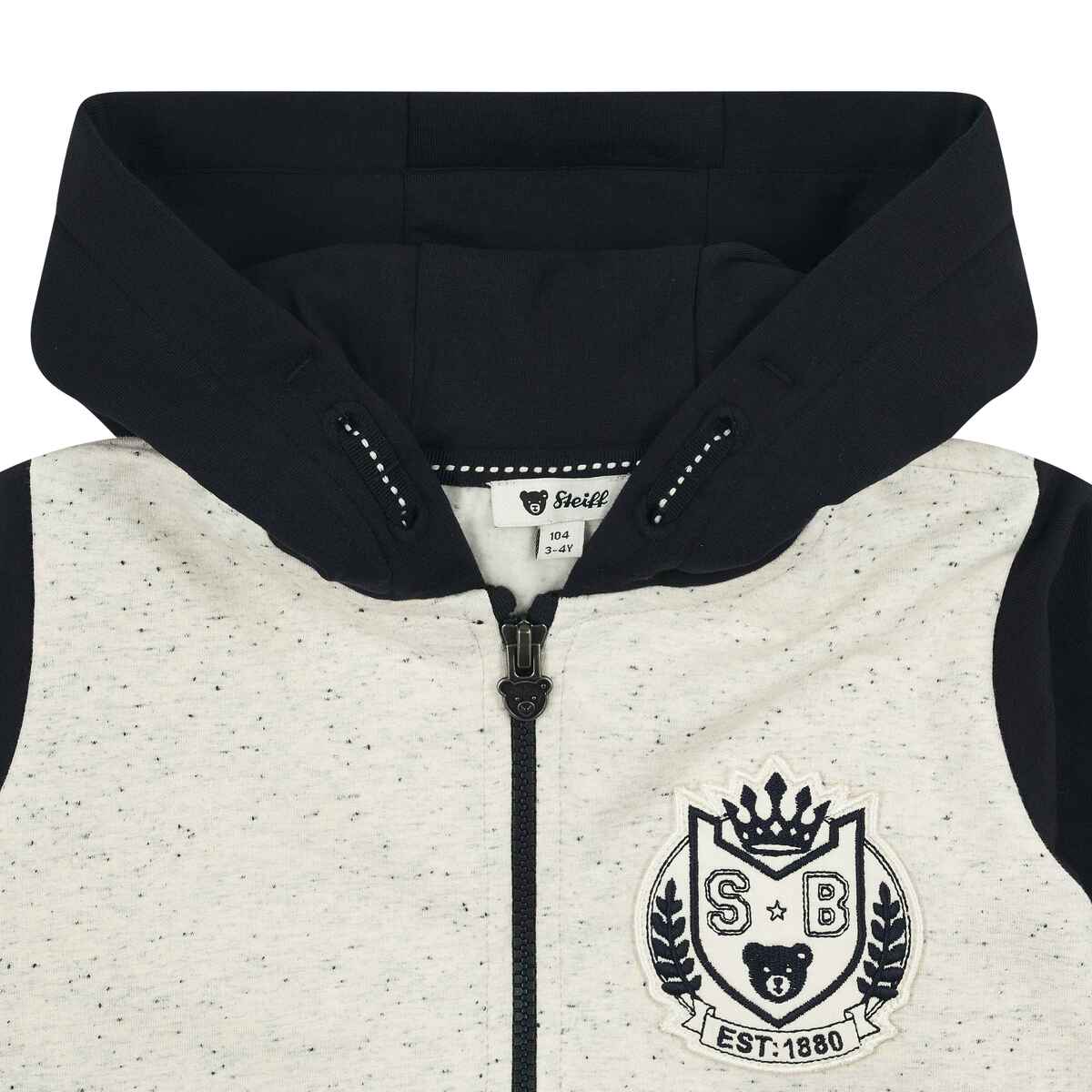 Стильный костюм Celebration в контрастных цветах сочетает спортивный дизайн и мягкий комфорт на каждый день. Застежка-молния с защитой подбородка и мягкие манжеты обеспечивают удобство и хорошую посадку, сочетание меланжевого бежевого с темно-синими деталями создает современный вид. На груди сияет объемный гербовый элемент в сочетании с классическим мишкой Steiff, добавляя образу характер. Брюки с эластичным поясом и завязками дарят свободу движений и комфорт, аккуратные контрастные акценты подчеркивают спортивный стиль. Мягкая ткань приятна к телу, делая костюм универсальным выбором для прогулок, игр и ежедневной носки.